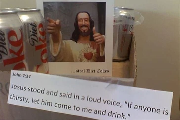 A questão das latas de refrigerante que desaparecem de um estoque comunitário introduz um impedimento humorístico, mas eficaz: uma imagem indutora de culpa destinada a desencorajar o ladrão.