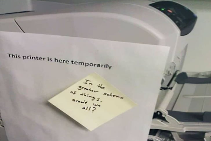 Durante uma queda da impressora, um indivíduo aproveitou a oportunidade para aliviar o clima com uma nota bem-humorada, provocando risadas e reflexão sobre as grandes questões da vida entre os colegas.
