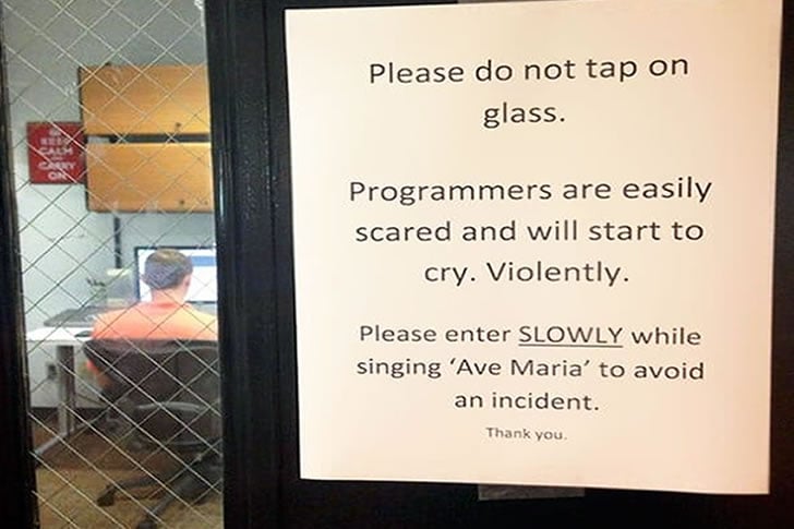 Num escritório onde ruídos repentinos perturbam a concentração profunda dos programadores, um aviso foi humoristicamente erguido, comparando a situação a assustar animais num jardim zoológico.