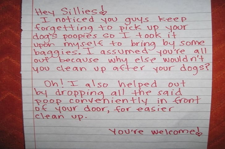 Confrontados com a desagradável situação de dejetos de animais de estimação não recolhidos, alguns escolhem uma resposta ousada, mas humoristicamente passivo-agressiva: deixar os dejetos à porta do infrator. Esta abordagem, embora extrema, comunica eficazmente o descontentamento num ambiente comunitário.