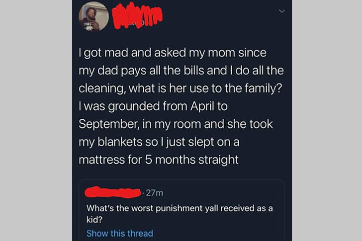 Comentário Principal:Quando eu tinha 12 anos, se eu jogasse mal em um jogo de hóquei competitivo (o que geralmente incluía seguir as instruções do meu pai em vez do meu treinador), eu era deixado na beira da estrada a alguns quilômetros (perto de uma milha) fora da cidade. Minha bolsa e meu taco eram jogados fora e eu tinha que ir para casa a pé. Na beira de uma rodovia de duas pistas com limite de velocidade de 80 km/h (50 milhas por hora). Nevascas, chuvas, o que você imaginar.