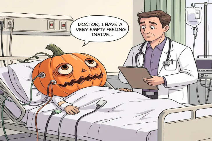 Este meme com tema de Halloween utiliza um trocadilho clássico: o paciente com cabeça de abóbora diz: “Sinto um vazio muito grande por dentro…”, o que funciona em dois níveis — abóboras são ocas e é uma piada com a qual muitos se identificam sobre sentir-se emocionalmente vazio. A expressão confusa do médico aumenta o humor, tornando-o perfeito para a época assustadora ou quando você só precisa compartilhar uma piada de “tiozão” com seus amigos.