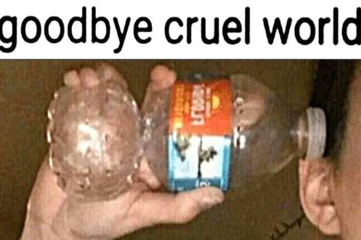 Este meme mostra uma lata de refrigerante esmagada ao lado de uma garrafa com o texto “adeus mundo cruel”, fazendo uma piada sombria e engraçada sobre a decepção de uma lata de refrigerante que explode na sua mochila. É a maneira perfeita de reagir a um pequeno e irritante desastre – como quando o seu almoço é esmagado ou os seus fones de ouvido quebram. A legenda dramática transforma um pequeno inconveniente numa reação exagerada hilariante.