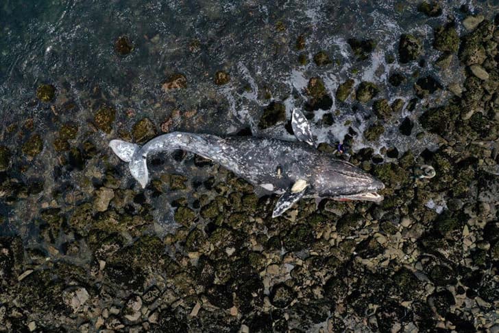 Esta é uma foto bastante triste, tirada por um drone, de uma baleia morta em um afloramento rochoso. É sempre doloroso testemunhar tais tragédias, especialmente considerando que nós, humanos, estamos destruindo os habitats de todas as criaturas. Esta imagem serve como um lembrete pungente do pedágio que a destruição ambiental causa à vida marinha. De cima, esta enorme criatura parece tão fora de lugar.