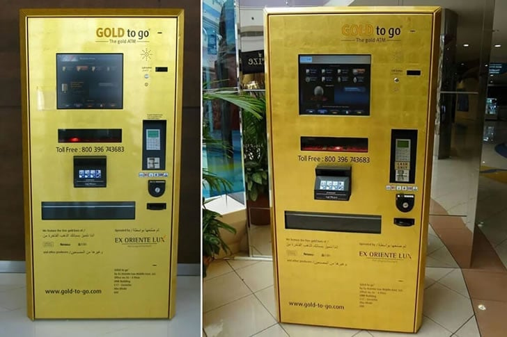 Caso os visitantes nos Emirados Árabes Unidos se vejam na necessidade de dinheiro imediato ou sintam o desejo repentino de adquirir uma barra de ouro, não precisam se preocupar, pois caixas eletrônicos projetados especificamente para esse fim estão prontamente acessíveis. Introduzido nos Emirados em 2010, o caixa eletrônico Gold To Go se tornou uma característica notável.