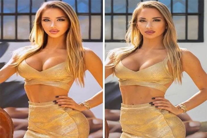 Na sua publicação, ela alterou o rosto de tal forma que quase não se reconhecia, enquanto na foto do fotógrafo ela também parece atraente, mas sem retoques.