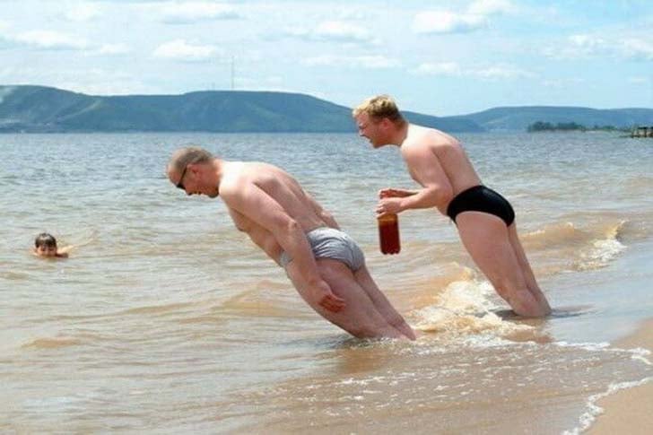 Parece que estão a imitar o famoso Michael Jackson, mas não consigo imaginar outra razão para estes dois estarem a fazer isto. Afinal, parece que o homem mais novo está a segurar numa garrafa, o que significa que não estão a planear nadar.