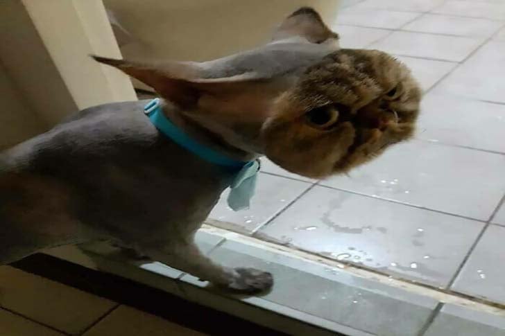 No começo, é difícil saber se esta é uma foto de um gato grudando o rosto no vidro ou se este gato apenas sofreu o pior corte de cabelo da história dos cortes de cabelo para gatos. Ele foi maltratado pelo tosador. Mesmo que precisasse raspar o corpo todo por causa de uma cirurgia ou algo assim, eles não deveriam ter deixado o rosto intacto.