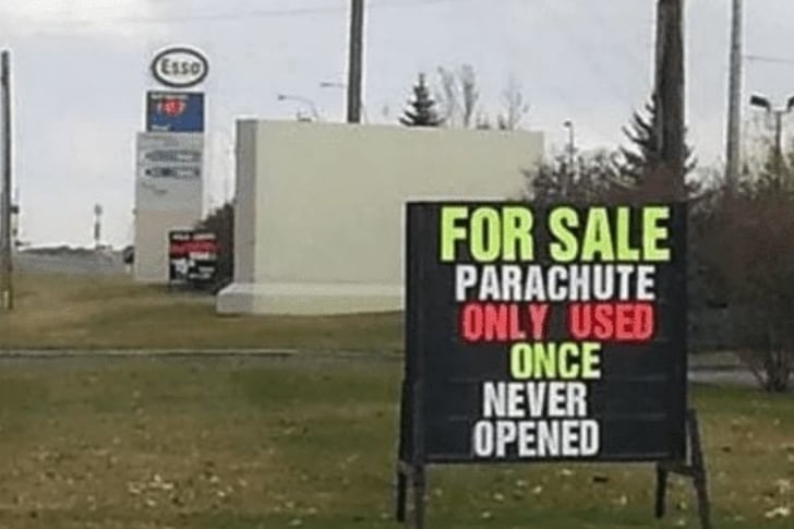 Não é incomum encontrar alguns anúncios de segunda mão estranhos, mas este definitivamente te faria sorrir – junto com todos os outros passageiros que o veem na beira da estrada. Se você já pensou em experimentar o paraquedismo, isso pode parecer uma oportunidade de ouro para conseguir um paraquedas de alta qualidade a um preço baixo.