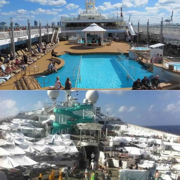 Relaxar no convés parece um sonho – até você perceber que a maior parte da sua vista está bloqueada por um mar de guarda-chuvas. Embora ofereçam sombra crucial contra o sol escaldante, eles também fazem com que o convés se pareça mais com um café lotado do que com um paraíso oceânico arejado.
