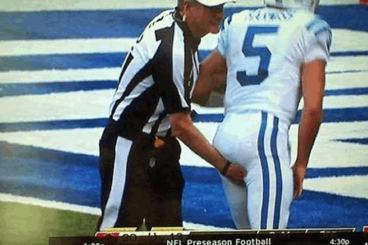 Ah, meu Deus, o árbitro atingiu a parte de trás do jogador de repente! Foi definitivamente um touchdown não planejado em uma área indesejada. Talvez o árbitro estivesse apenas procurando moedas perdidas nos bolsos e, de forma bem-humorada, tropeçou nesse “ataque amigável”.
