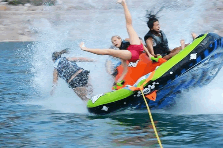 Poetas descreveram as ondas como o ir e vir dos acontecimentos da vida. Além das contemplações fugazes e dos momentos perecíveis que o mar evoca, parece haver outra maneira de apreciá-lo: praticar esqui aquático atrás de um bote inflável. É evidente o quão selvagem o mar às vezes pode ser, como mostram as garotas nesta imagem perfeitamente cronometrada. A suposição de que o rafting era apenas um passeio de barco simples foi talvez o maior erro que elas nunca mais cometerão.
