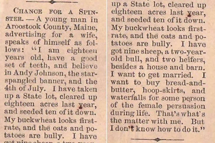 Swipe left on Tinder and feast your eyes on this gem from the late 19th century: a newspaper ad by an 18-year-old man looking for a wife. That’s right — no apps, no emojis, just pure handwritten desperation printed on actual paper. He was young, eager, and probably owned one good vest. His criteria? “Decent, God-fearing, and able to churn butter.” Romantic, right?