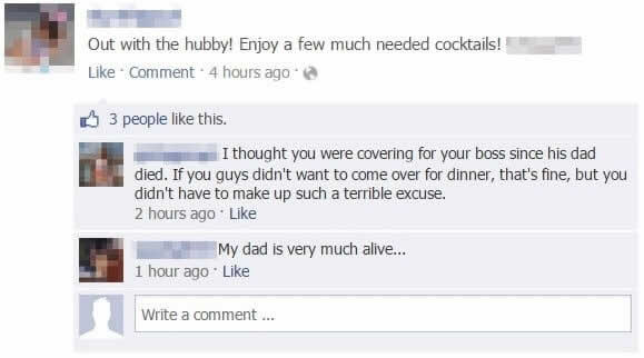 After telling a friend she couldn’t make it because her boss’s father had passed away, she proceeded to post photos of herself enjoying cocktails with her husband. The friend she stood up—and her very much alive boss—both saw the post.