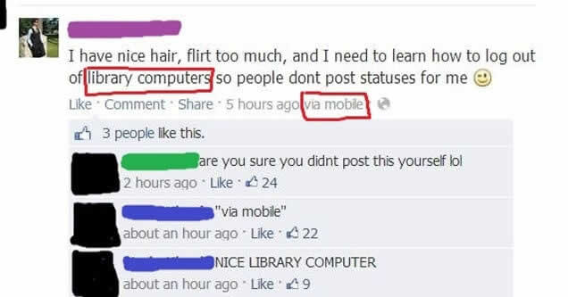 This particular lie is almost sad because it shows a desperate need for external validation. A girl tried to make herself look popular by pretending that a “secret admirer” had hijacked her Facebook account while she was away from a library computer.