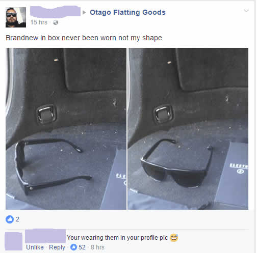 A guy tried to sell a pair of sunglasses as “brand new and never worn.” The only problem was that his actual profile picture showed him wearing those exact same glasses. A potential buyer caught the discrepancy immediately and called him out in the comments.