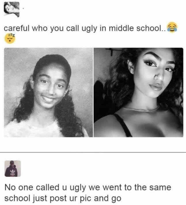 Bullying is a serious issue, but using it as a fabricated backstory to get sympathy is a new low. This girl shared a “glow-up” post, comparing a middle school photo to a recent one with a caption about how people used to call her ugly.