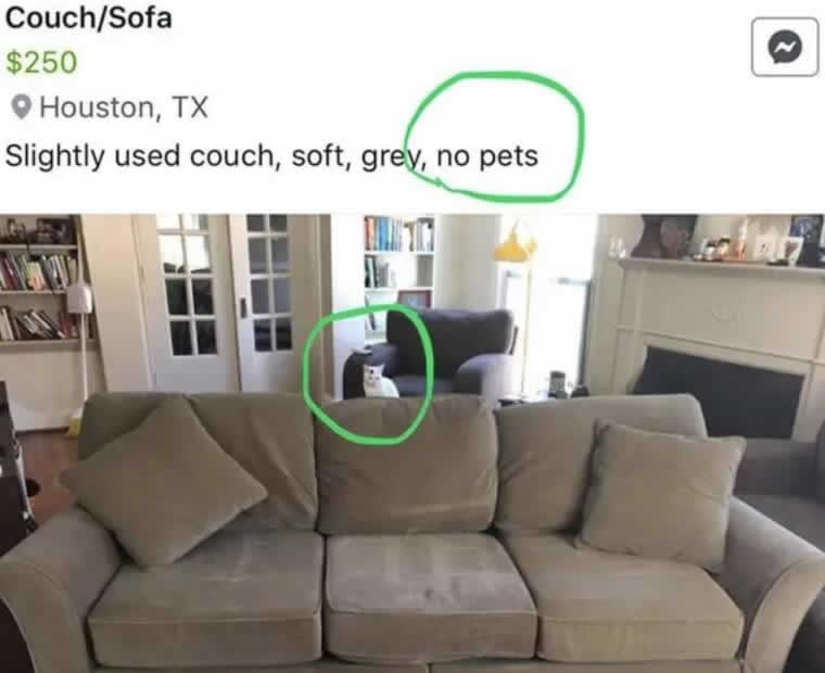 Selling furniture online requires a bit of attention to detail, especially if you’re making specific claims about cleanliness. This person tried to sell their couch, emphasizing that it came from a “pet-free” home to attract buyers with allergies.
