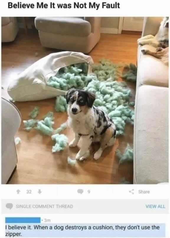 An observant commenter noticed a fatal flaw in the staging: the pillow’s zipper was neatly undone. It’s highly unlikely a dog would carefully unzip a pillow before destroying it, suggesting the owner did the work themselves for the sake of a viral post.