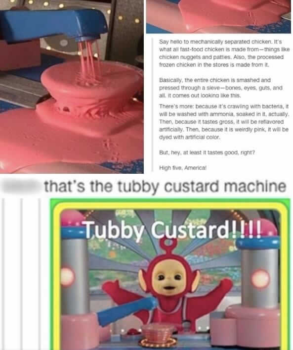 The post went viral and caused a lot of disgust until someone pointed out the truth. The image wasn’t food at all; it was a behind-the-scenes photo of the “Tubby Custard” machine from the children’s show The Teletubbies.