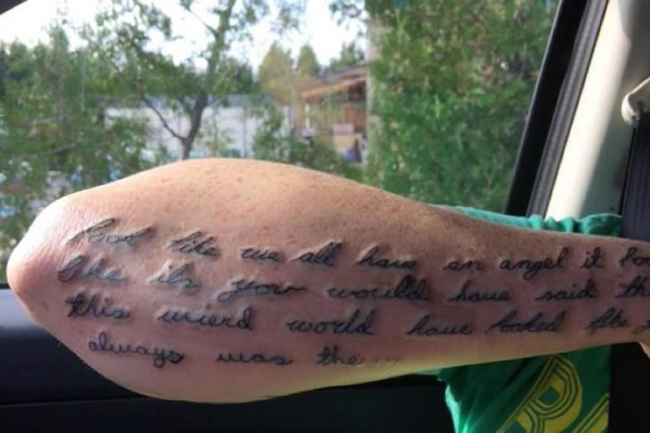 Some tattoos feature loved ones’ handwriting to add a personal touch, but this one looks like an illegible doctor’s scribble. Even the wearer can’t read what it says, turning the tattoo into a permanent mystery note on their skin.