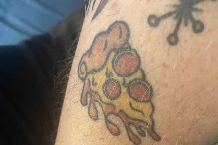 Pizza tattoos should be fun and mouth-watering, but this one looks more like melted cheese with random red blobs scattered across a burnt crust. The “pepperoni” is unrecognizable, and the overall tattoo resembles an abstract art piece gone wrong. Instead of tempting anyone’s appetite, it causes confusion.