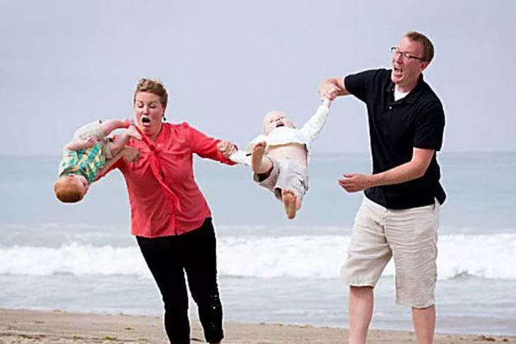 An einem sonnigen Strand beschlossen zwei lächelnde Eltern, ihre Babys hoch in die Luft zu schaukeln, um einen freudigen Moment festzuhalten. Doch die Physik hatte andere Pläne. Da nur ein Elternteil jedes Baby hielt, gab es nichts, was die Kleinen sicher am Boden hielt. Dieses Familienfoto ist Stoff für Internetlegenden – und leichte elterliche Panik.