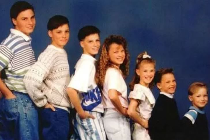 Dieses Foto von sieben nach Größe aufgereihten Geschwistern ist sowohl charmant als auch urkomisch inszeniert. Jedes Kind trägt Jeans, was entweder auf eine Familienbesessenheit mit Denim oder einen professionellen Fotografen hindeutet, der eine sehr spezifische Vision hatte. Die dominosteinförmige Anordnung trägt zur visuellen Komik bei.