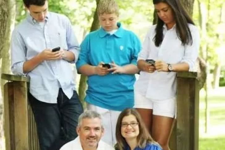 Dieses Familienfoto sollte ein schöner Moment sein, doch es entlarvte ein sehr reales Problem – die Technologiesucht. Die drei Kinder, jedes an sein Handy gefesselt, ignorieren völlig die Kamera, ihre Umgebung und wahrscheinlich auch ihre Eltern.