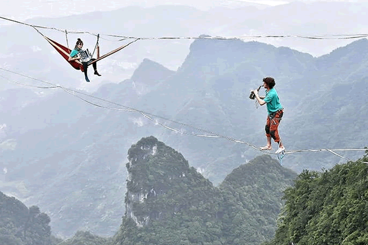 Les personnes que vous voyez sur la photo portent des harnais de sécurité, mais même avec eux, cela semble effrayant. Pourquoi sont-elles même là-haut ? Ces deux-là sont membres d’un groupe de musique de slackline appelé Houle Douce, et la photo date de 2018. Ils s’entraînaient pour une performance d’acrobatie aérienne dans le parc forestier national de Zhangjiajie, dans la province du Hunan en Chine. À 1400 mètres au-dessus du niveau de la mer, ils ont fait preuve de courage et de talent, sous les yeux du monde entier. Il ne fait aucun doute que ces deux-là méritent une grande reconnaissance pour leur travail.