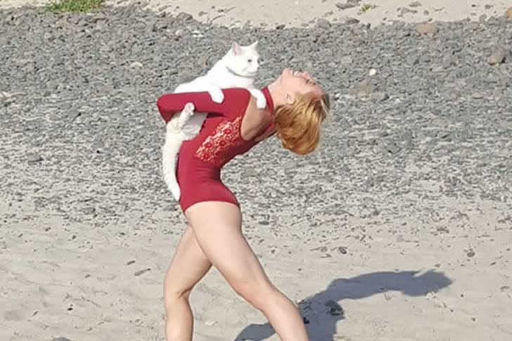 如果你是貓奴,你一定知道貓咪對沙子有著一種奇怪的迷戀。畢竟,那基本上就是牠們的天然貓砂盆。但在這張照片中,沙子遇上了優雅。一位舞者在沙灘上擺出優美而沉著的姿勢,但所有人的目光都集中在 Buns 身上——這隻搶盡風頭、華麗又好奇的貓咪。