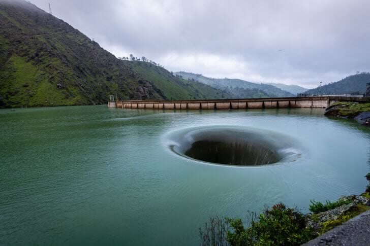 這個在加州完美圓形的溢洪道,被戲稱為「挪威海怪洞穴」,看起來就像科幻電影裡的東西。雖然它不是自然現象,但其對稱的設計和漩渦般的水流,使其既美麗又令人毛骨悚然。從上方看,它就像一個神秘的漩渦,彷彿要吞噬整個湖泊——因此贏得了這個恰如其分又駭人的綽號。