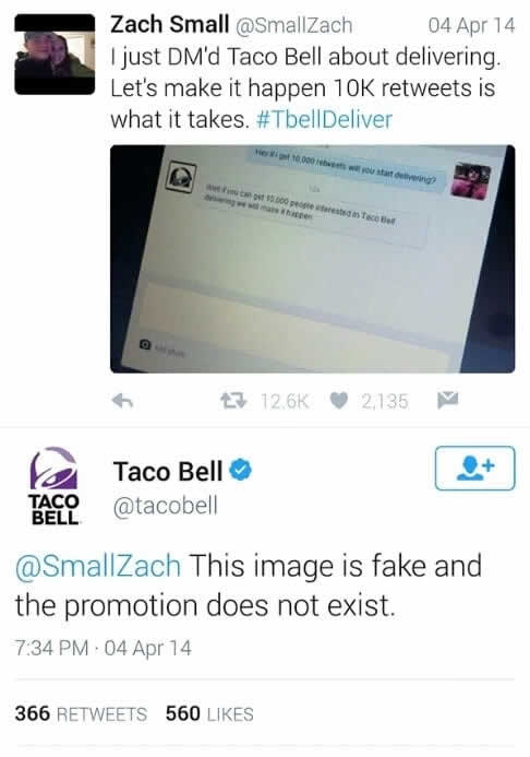 為大型品牌捏造虛假促銷活動是一項危險的舉動,因為這些公司都有專門的社群媒體團隊負責監測不實資訊。塔可鐘 (Taco Bell) 這個深受粉絲喜愛的速食連鎖店,尤其注重其線上品牌形象。